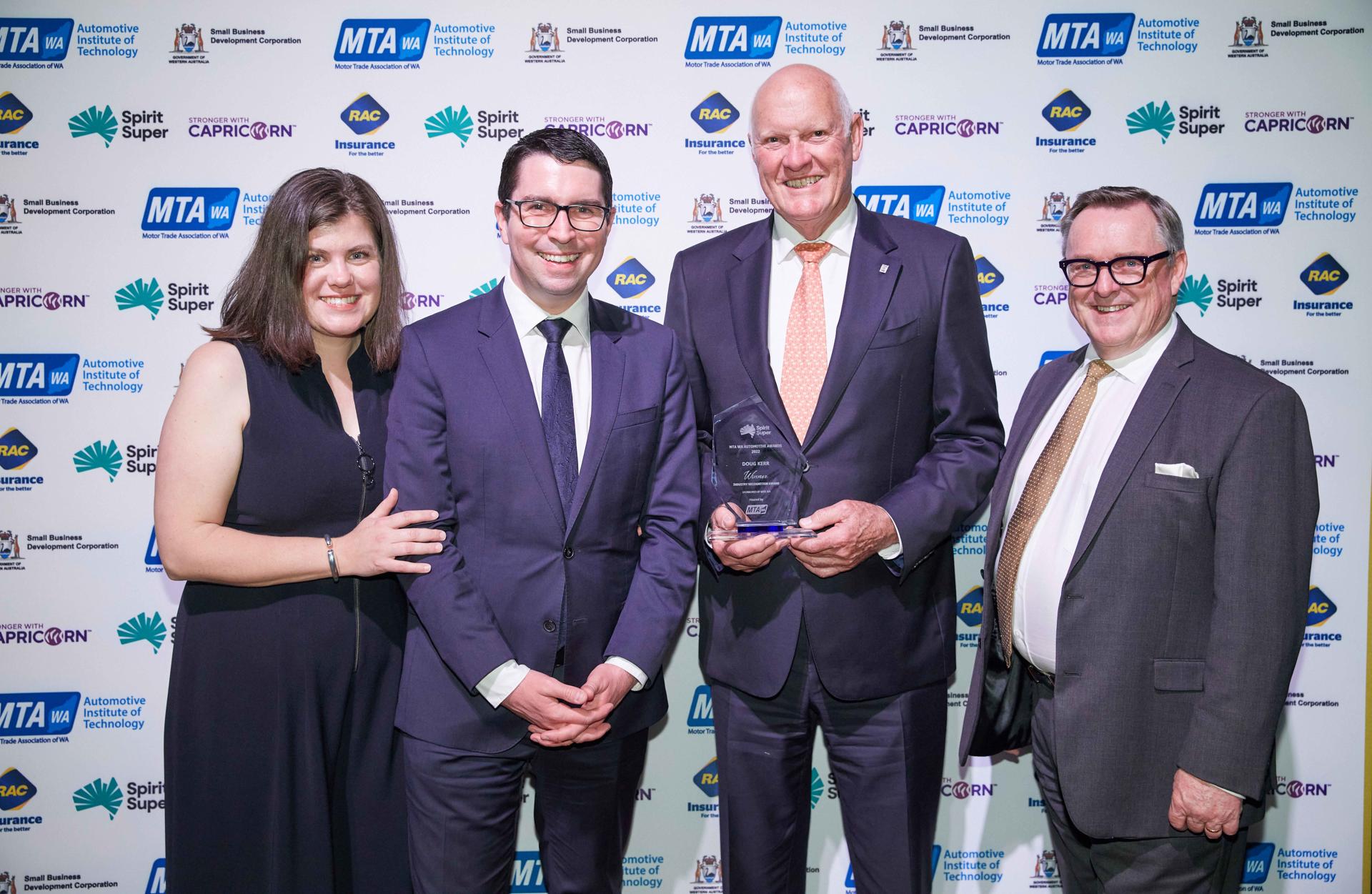 Doug Kerr, Chair Shacks Motor Group, celebrates his MTA Industry recognition award alongside (L-R) Jess Gorman, The Hon Patrick Gorman MP, Assistant to the Prime Minister and Stephen Moir, CEO MTA WA.