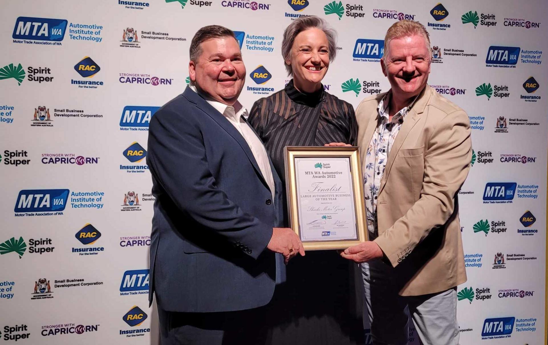 Stuart Long, Dealer Principal Rockingham Volkswagen & GMSV, Jodi Kerr, Managing Director and Dealer Principal (Shacks Fremantle) and John Leech, Dealer Principal Rockingham Mazda accepting the Finalist certificate for Large Automotive Dealerships of the year.